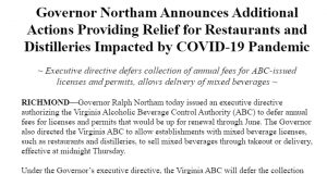 Gov. Northam Announces Additional Actions Providing Relief for Restaurants and Distilleries...