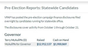 Mid-October Virginia Campaign Finance Reports Now Available; McAuliffe, Ayala and Herring...