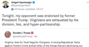 Rep. Abigail Spanberger (D-VA07): “Tonight, my opponent was endorsed by former...